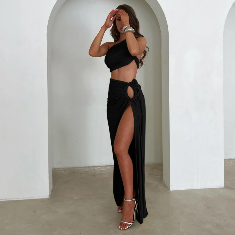 Conjunto feminino de 2 peças, composto por um top sem mangas com ombro oblíquo e uma saia longa com fenda alta. Feito de material de poliéster, confortável e com design boêmio.