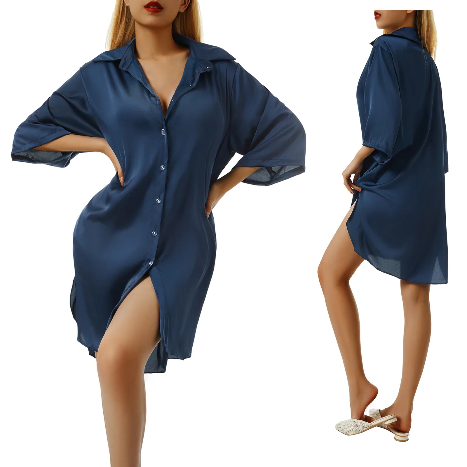 Camisa de dormir de seda com manga curta e colarinho, ideal para mulheres que buscam conforto e estilo para dormir. Feito de material de seda e poliéster, com design simples e elegante.